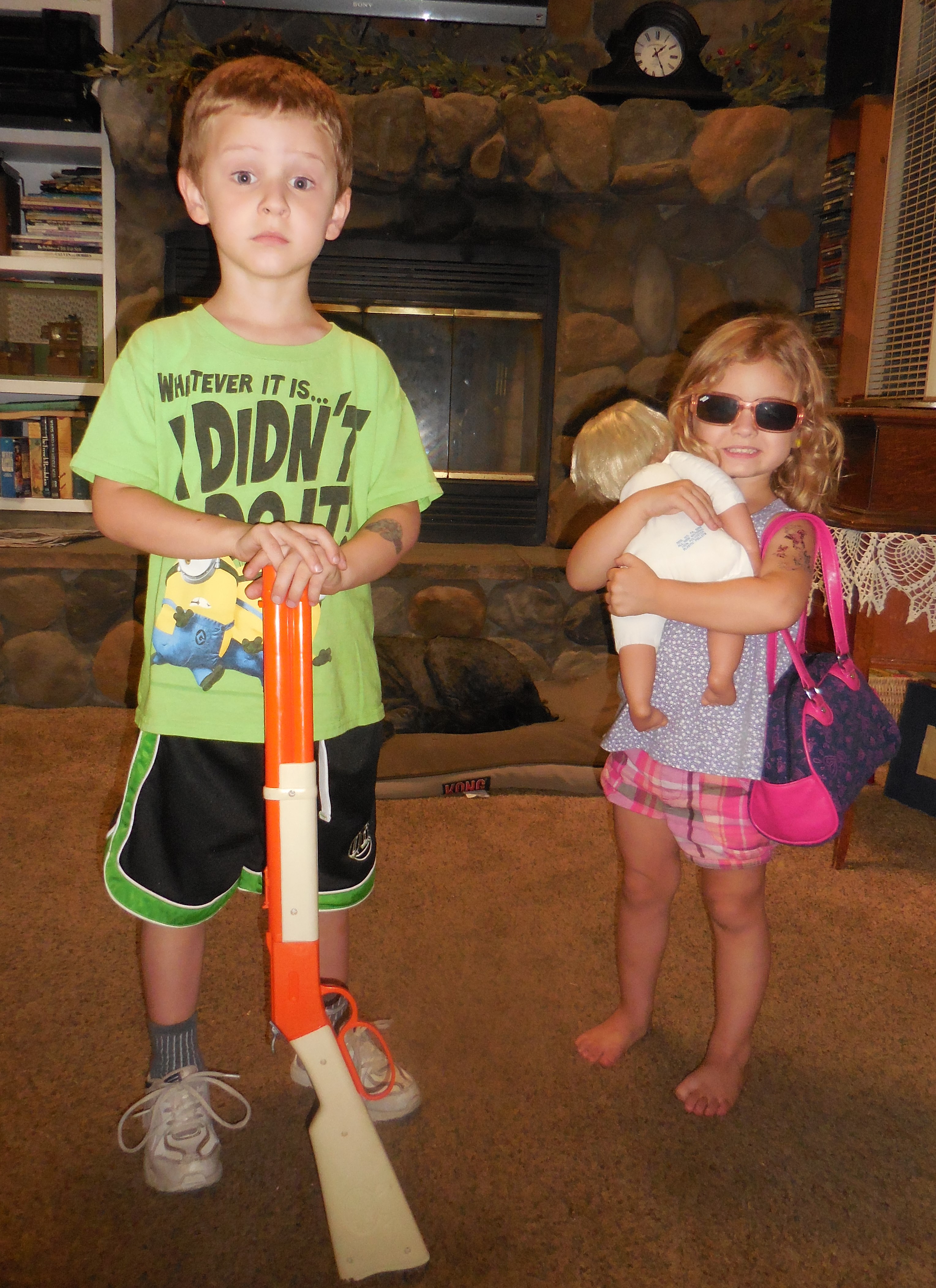 He comes by it honestly, ladies. I think hunting is programmed somewhere deep in a man’s DNA. Recently we had our grandkids over, and my 4 year old grandson trooped through the living room carrying his toy rifle saying “We’re going target shooting”. And His 3 year old sister was right behind him with her sunglasses, purse, and baby doll saying ”Yes, we’re going to Target!”